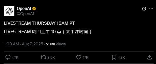 北京时分周五凌晨1点,OpenAI将举行发布会,推出备受期待的GPT-5。