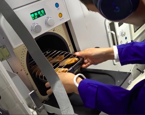 神舟二十一号乘组带去了一台新配置——炎风烘烤机。他们与神舟二十号的“战友”会师后,迫不足待地远离腌制好的鸡翅,用特制的签架固定好,送入这台机器。